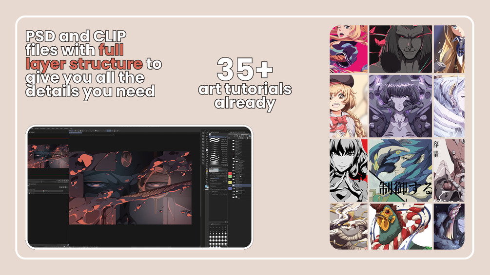 Videos are not left behind. In-depth art tutorials and speed paintings will give you knowledge on how to progress through the image and what decisions were made during the creation. If you want more, just check the layered CSP file or PSD file for some in-depth knowledge on how the image was created layer-wise. Full layer structure available.